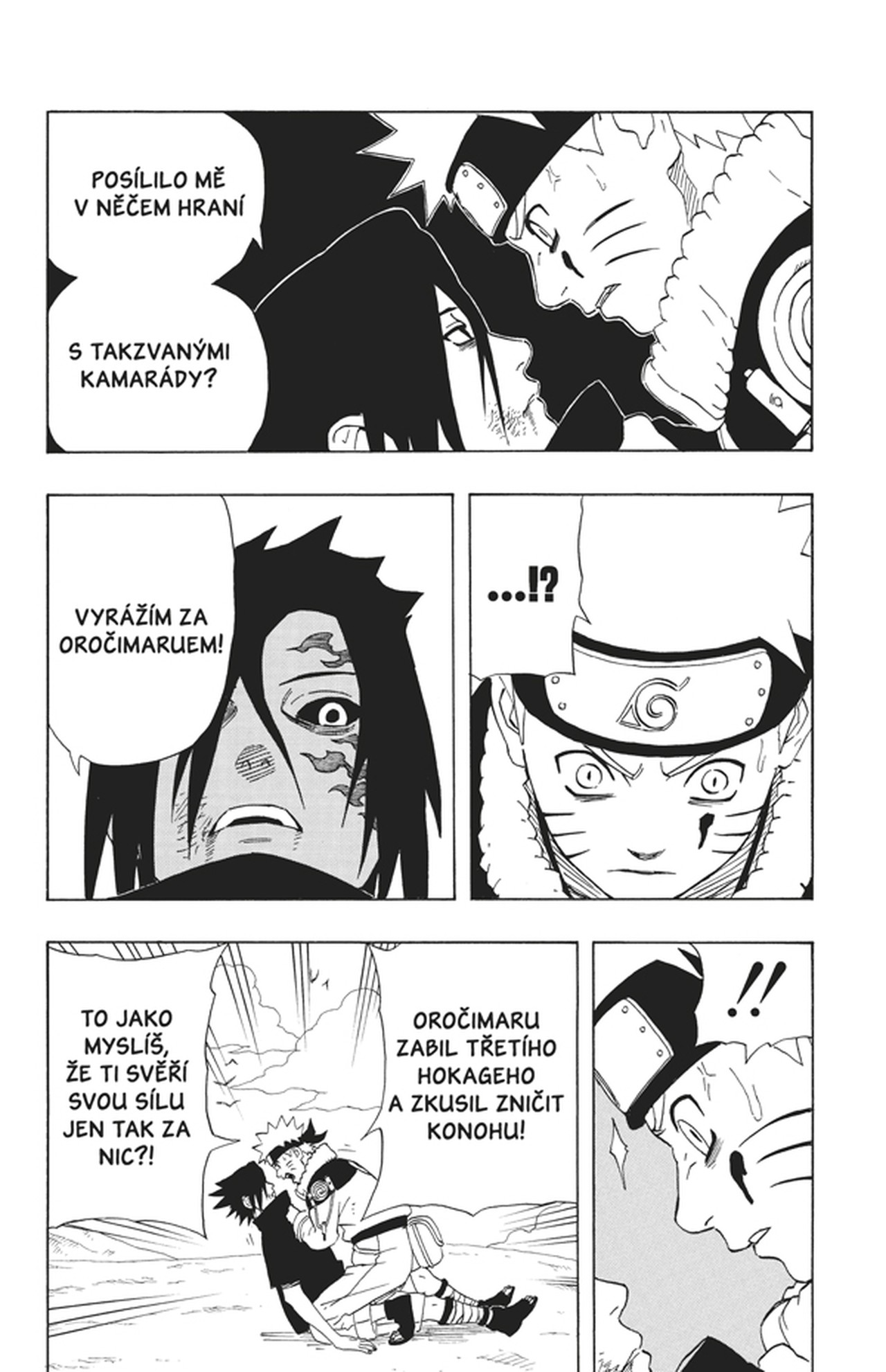 Pečeť je zlomená, Sasuke se probouzí. Místo radosti nad kamarádovým návratem však čeká Naruta trpké prozření. Jeho rival se odmítá vrátit a v touze po moci pokračuje v cestě za Oročimaruem. Zmatený Naruto přenechává zbytek bitvy přátelům a vrhá se za Sasukem. Netuší, jak temné vzpomínky skrývá dědic kdysi slavného klanu Učihů.