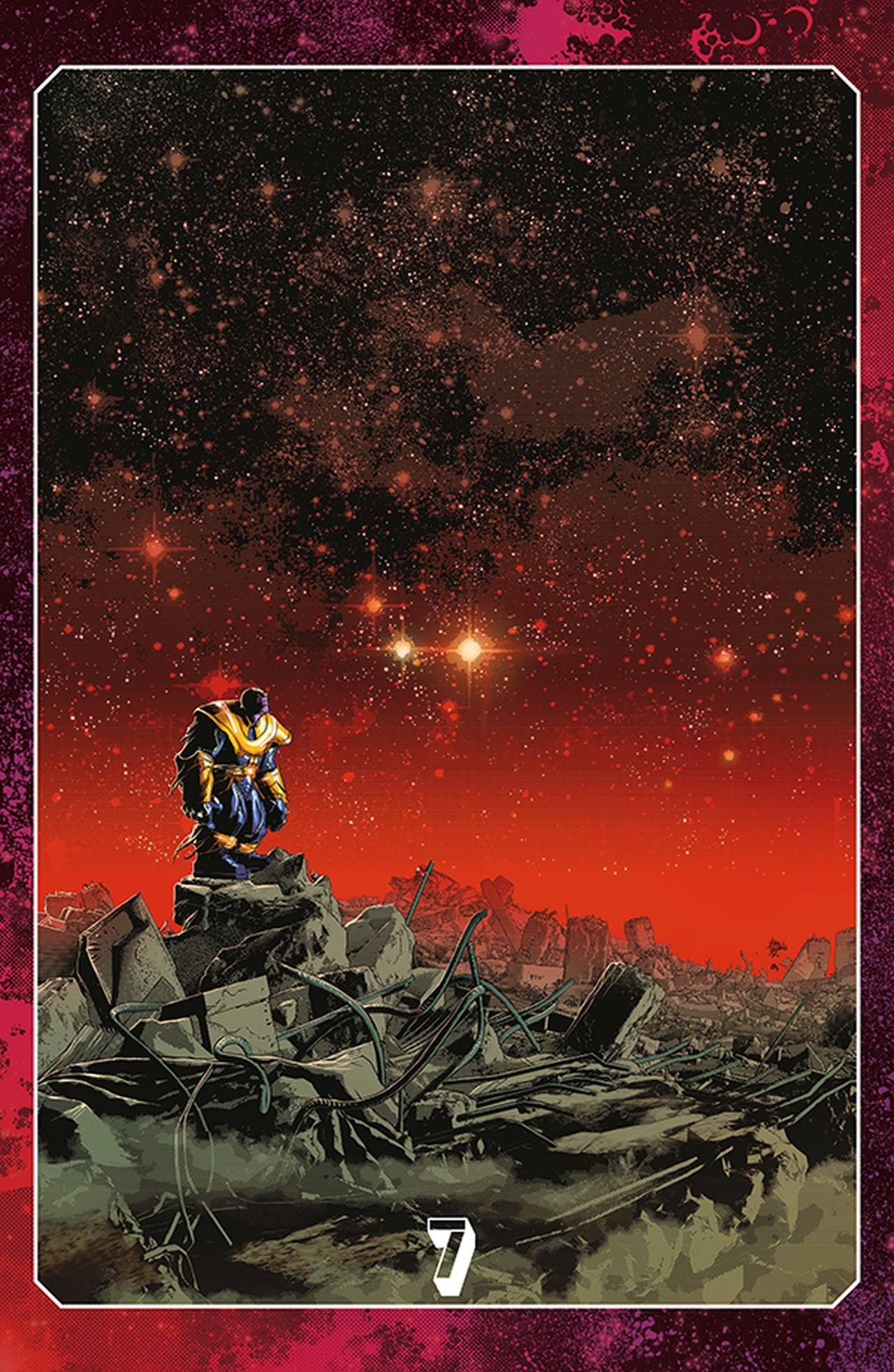Je odhodlaný udělat vše, aby přežil, přestože to znamená přijmout pomoc, která přichází z těch nejnepravděpodobnějších míst! Když se však vynoří hrozba, která je ještě strašlivější než Šílený Titán sám, budou životy nás všech záviset na vůli oslabeného Thanose k životu! A pak je tady ta drobná lapálie s Lomem bohů. Nikdo, kdo do něj vstoupil, se ještě nevrátil - a nyní je řada na Thanosovi, aby prozkoumal jeho hlubiny. Ale to není nic proti tomu, co následuje: Nejmocnější pozemský hrdina! Vůdce Avengerů! Šampión veškerého dobra! Thanos?! Ale přežije kosmos závěrečný a odpovídajícím způsobem násilný souboj mezi Thanosem a jeho synem Thanem - souboj, který neodvratně otřese celým vesmírem?