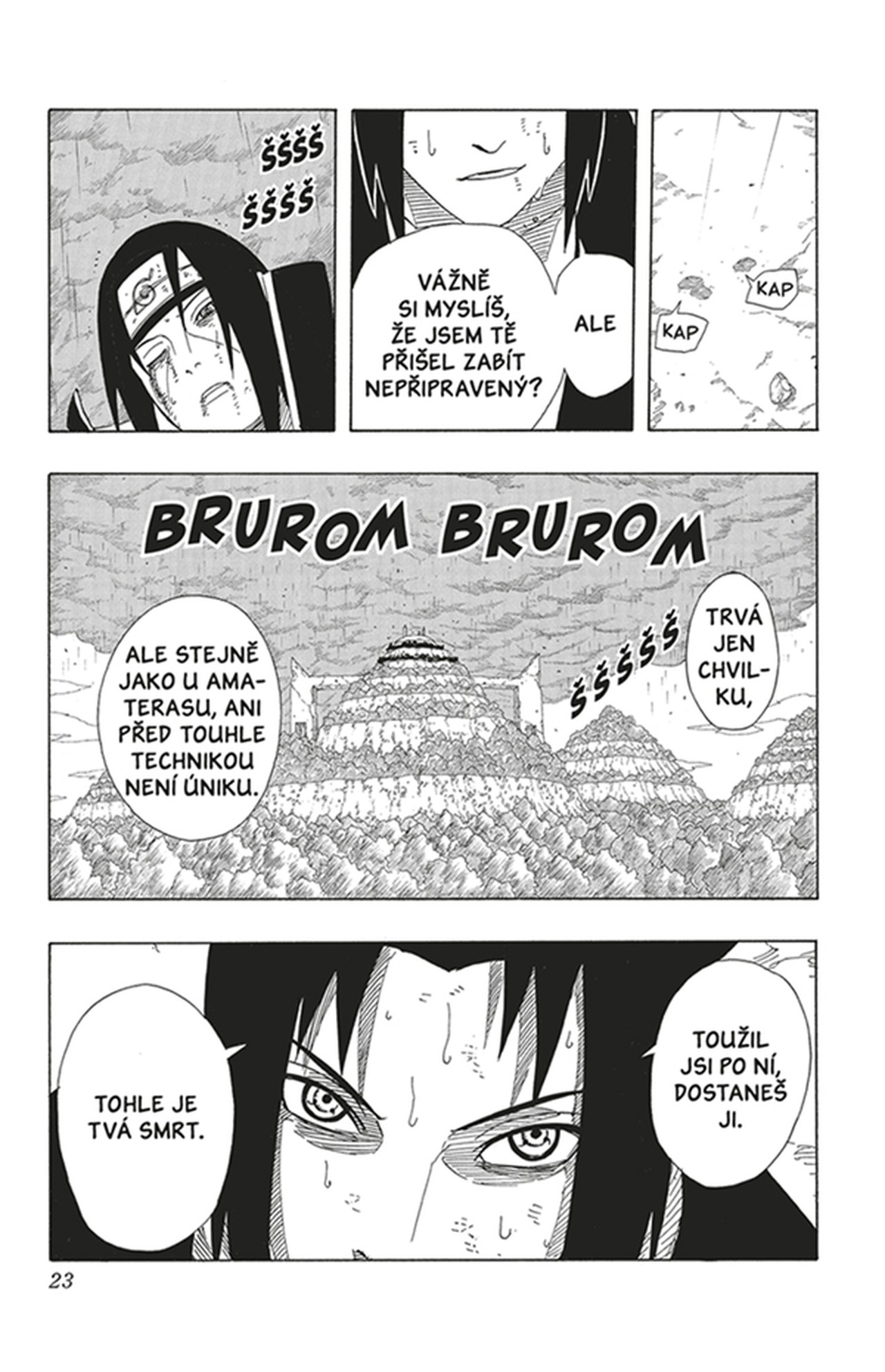 Souboj dvou bratrů nepolevuje. Sasuke do boje vysílá vše, co se u Oročimarua naučil, a Itači kontruje dalšími technikami tajemného Kaleidoskopu. Porážkou bratra ale nic nekončí. Děsivá tajemství rodu Učihů se derou na povrch. Informace, které se Sasuke prostřednictvím Madary dozvídá, navždy změní nejen jeho pohled na Itačiho, ale i na celý klan, a také otřesou celým světem nindžů od základů.