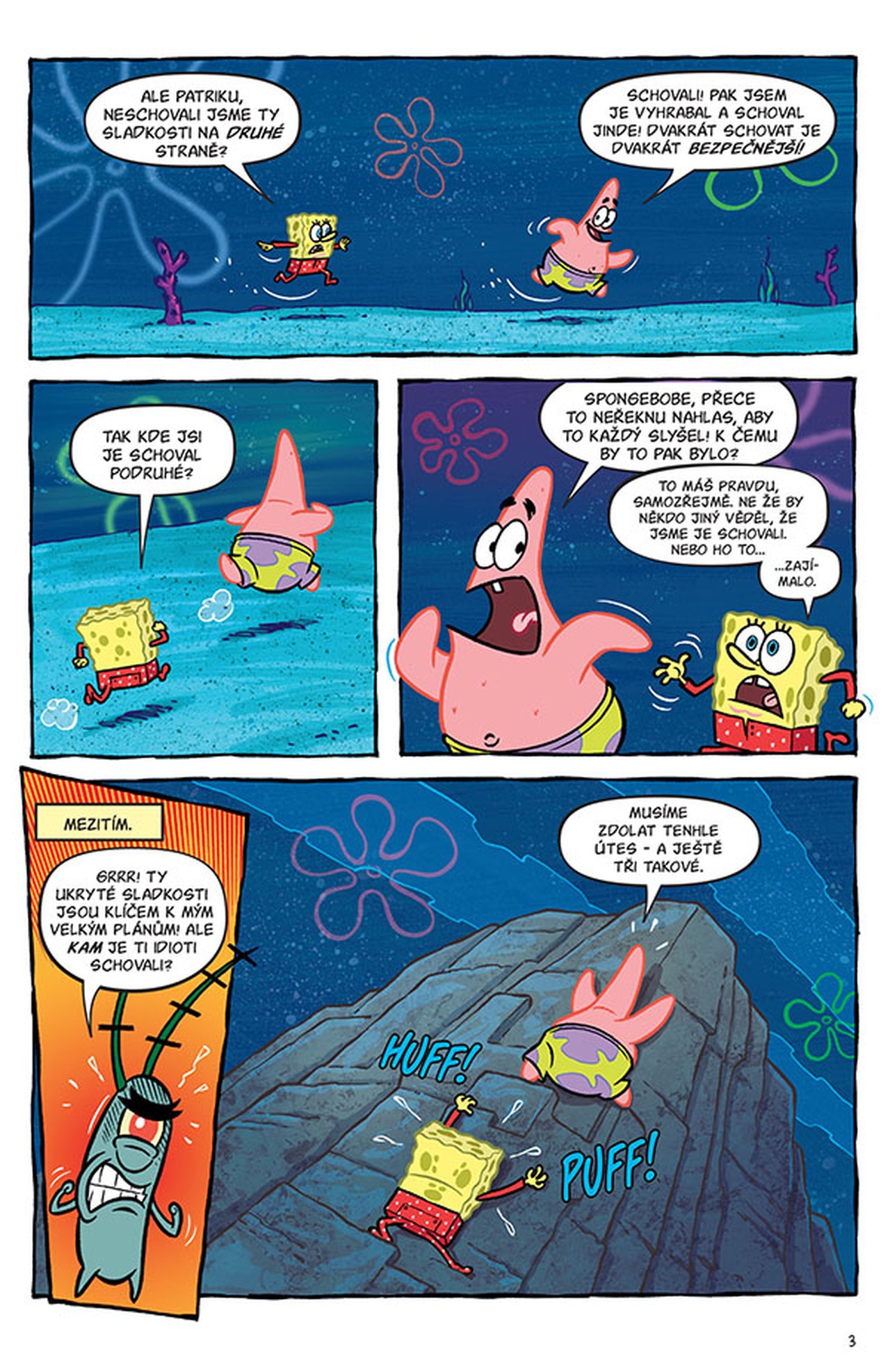 Noční výprava za pamlsky muže být pěkně napínavá! Dovedete si představit SpongeBoba v kalhotách… bez kalhot? A jaképak tajemství se dozvíme z Patrikova deníčku? Doufám, že recept na jeho neuvěřitelnou omáčku! A jestli se chcete naučit, jak NEkreslit SpongeBoba, počkejte si na další číslo!