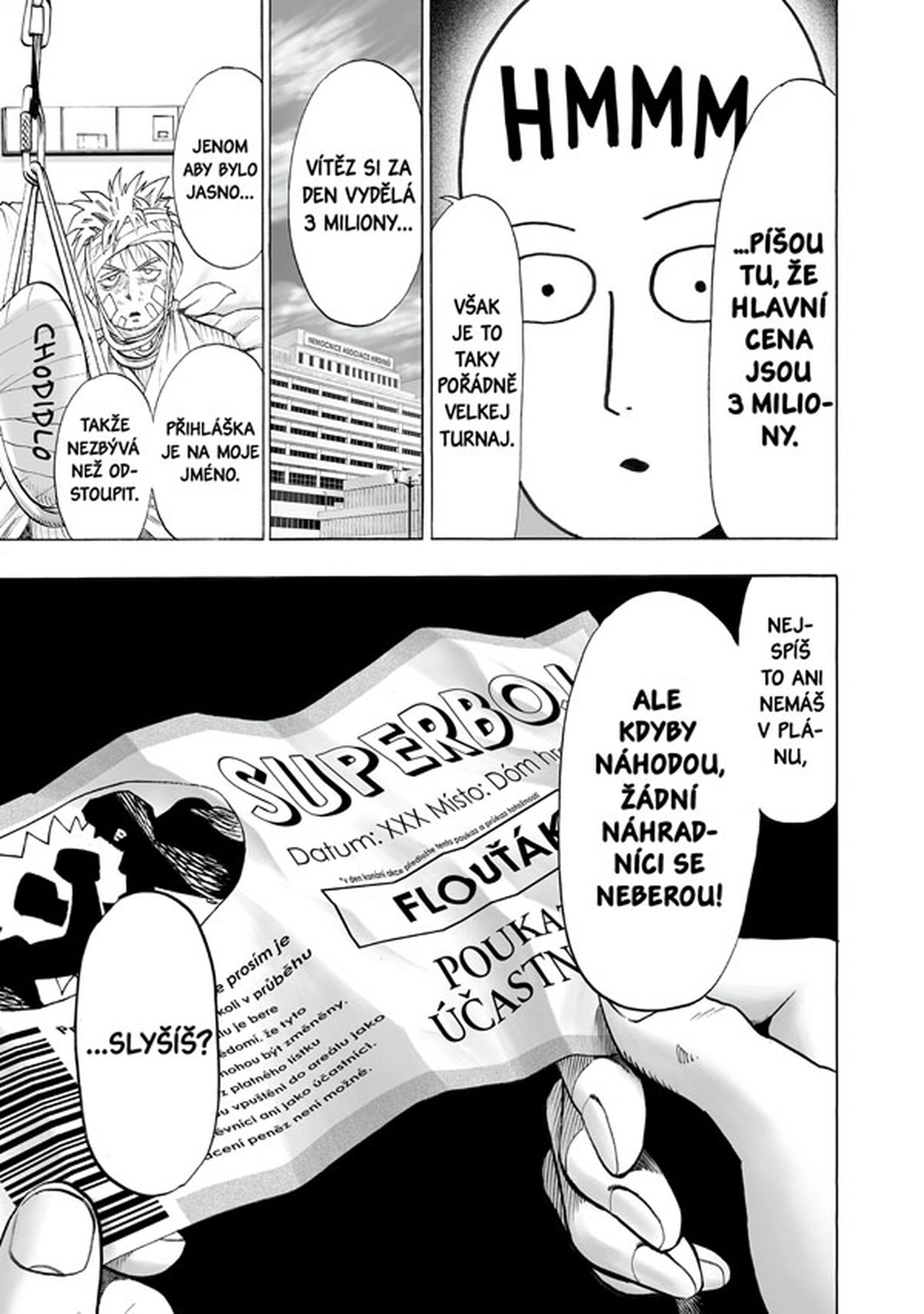 Garó, lidská příšera, zintenzivňuje svůj „hon na hrdiny“. Napáchané škody se zvětšují, nervozita v hrdinské branži roste, ale Saitamu zatím zaujmou bojová umění a rozhodne se tajně zúčastnit turnaje.