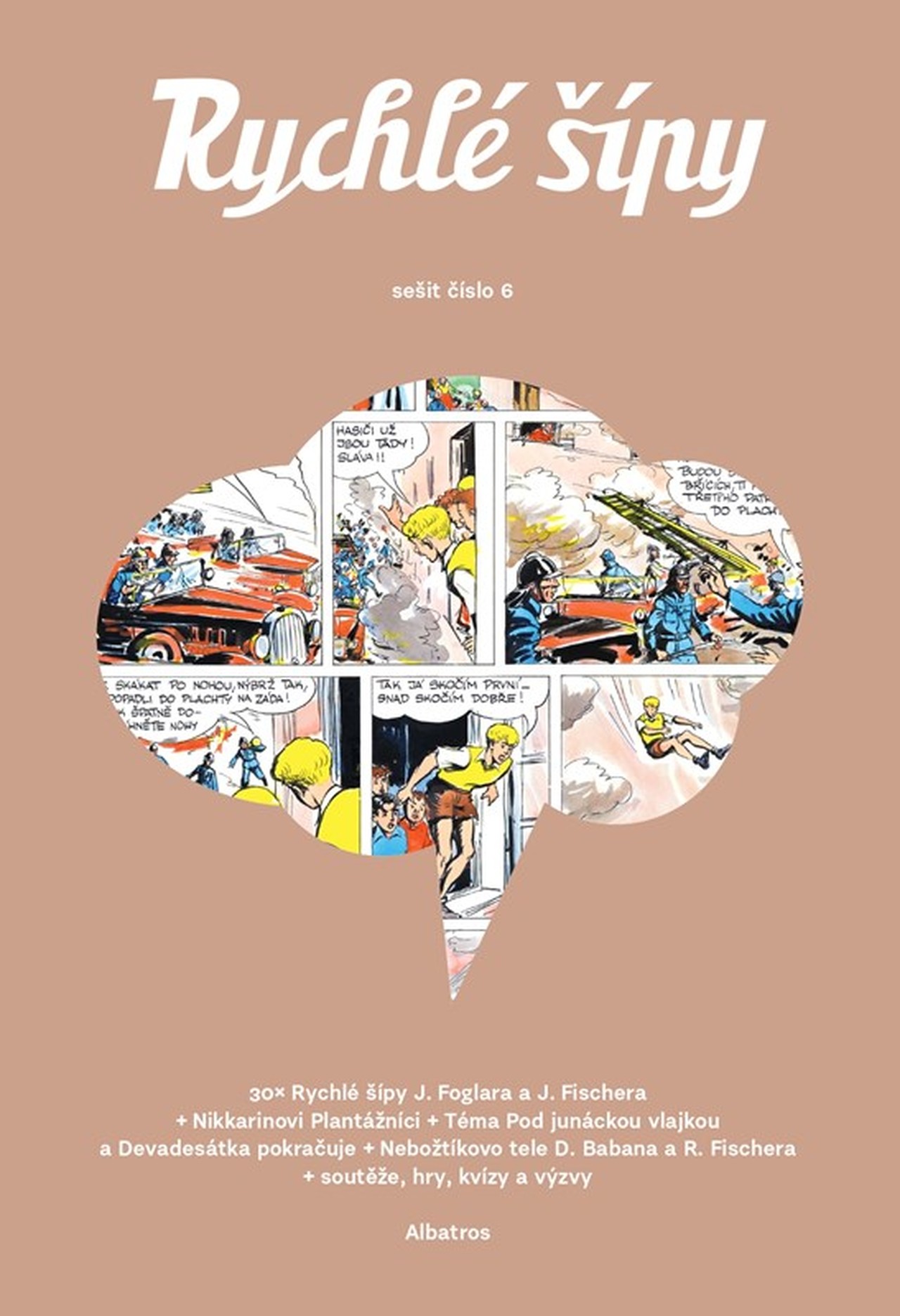 V moderním sešitovém vydání Rychlých šípů najdete původní díly slavného komiksu i nové příběhy ze světa Jaroslava Foglara od současných tvůrců. Tématem šestého čísla jsou knihy Pod junáckou vlajkou a Devadesátka pokračuje, na které odkáže komiks Marka Pokorného a únikovka Honzy Smolíka. Velkým komiksem bude Nebožtíkovo tele od autorů komiksové ságy Rváčov – Džiana Babana a Richarda Fischera, který nás přivede k nálezu mrtvých německých vojáků ve Stínadlech. A pokračují samozřejmě i Nikkarinovi Plantážnici.